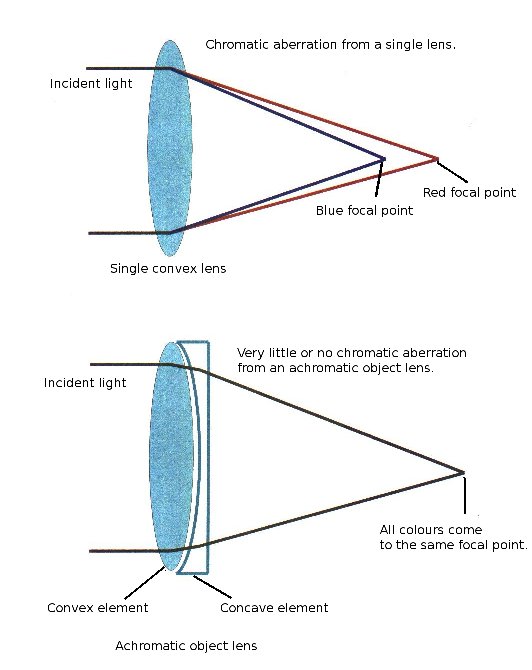 So the two lenses or elements, being of opposite types cancel out each other's undesired effect. This is how modern refractors overcome chromatic aberration or false colours. Some refractor designs use three elements to make up the objective and these are known as "apochromatic lenses"