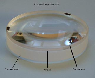 So modern refracting telescopes use a compound lens at the front of the tube, which consists of at least two lenses or elements, sometimes more. These elements when put together are known as the telescope's "objective lens". The simplest uses just two elements. The first lens or element is of the convex type (same as Grannys magnifying glass). This is followed very closely by a concave lens. Often the two lenses are bonded together, with a small air gap, so that they appear to be one lens. The idea is that both elements cause the undesirable effect, chromatic aberration, but in opposition to each other. And opposites cancel out (unlike the song!). This type of objective lens with just two elements is called an "achromatic lens".