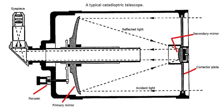 To understand how this somewhat curious design works, it is easier, for the time being, to think of them as a short Newtonian reflector with a type of lens placed across the front of the tube. Also for now I will refer to both types as CATs. Not to confuse this CAT with the furry variety.